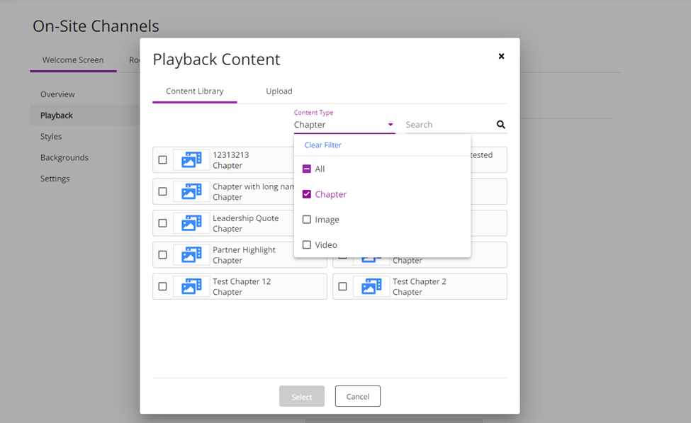 “Chapter” shall be added as an option to filter in the “Content Type” field.