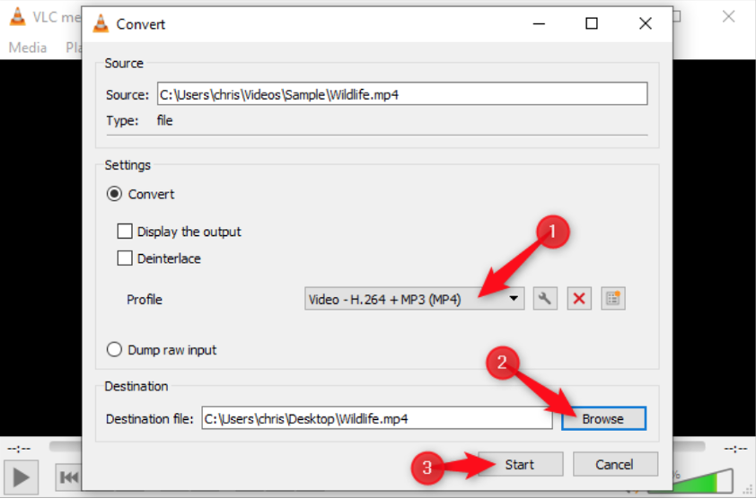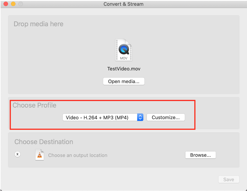 - Ensure the “Choose Profile” is set to “Video – H.264 + MP3 (MP4)”