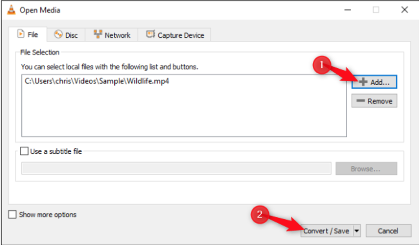 - Click “Add” to the right of the File Selection list on the File tab. Browse to the video or audio file you want to convert and open it.