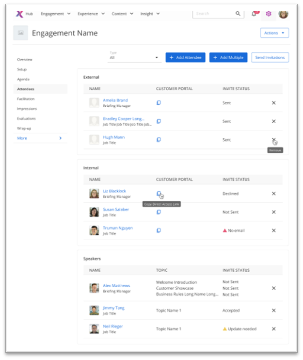 Attendees tab in the Briefing details was redesigned and updated. Now Speakers are displayed on the Attendees tab as a different attendee type. Additionally, all participant types will be displayed alphabetically in separate tables. “No <participant type> has been added to this engagement” message will be shown in the participant table If no participants are added to it.