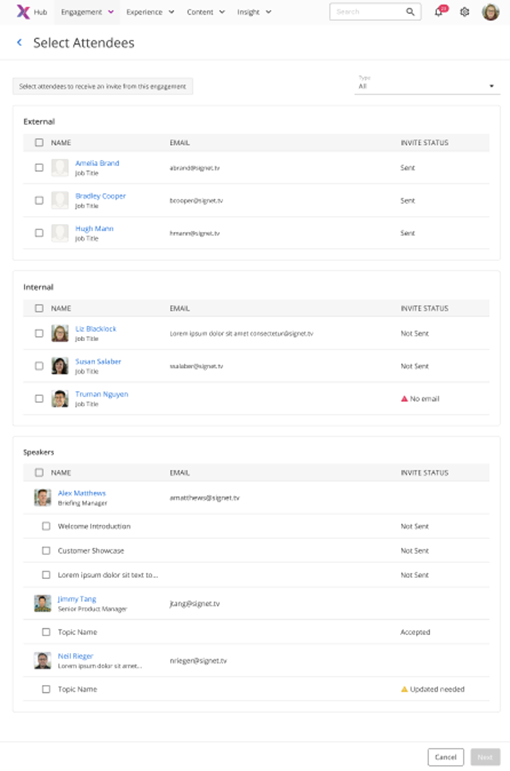 By clicking the “Send Invite” button, the User will be navigated to the updated “Select Attendees” page. On the page, the User can select what Attendees’ emails will be sent. This page will be displayed for all emails sent manually from the Engagement: Invites, Customer Portal Links, and Post-Engagement Emails.