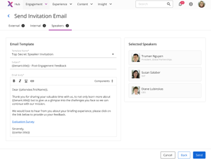 The User will see the template assigned as default for this Center and Engagement type on each tab. Users can select any other template available for the email type chosen. Users can update the “Subject” and “Email body” before sending them to the selected participants. If the user wants to update the participant selection, they can click on the back button at the page button or the back arrow to the left of the page label. In this case, the User will be navigated to the Attendee selection page, displaying the previous selection. If the user reloads this page, Suer will be navigated to the previous page without preserving participant selection.