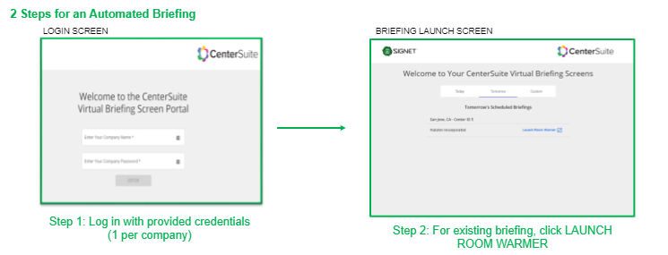 Signet's Virtual Screens are integrated into the briefing tool currently used and will display CONFIRMED meetings in the Launch Screen but also offer the ability to create an ‘off the cuff’ meeting utilizing the custom screens.