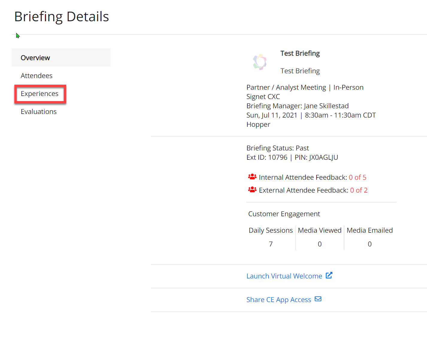 To access the feature, Log into the CenterSuite Platform and select a briefing. From the Briefing Overview, select EXPERIENCES.