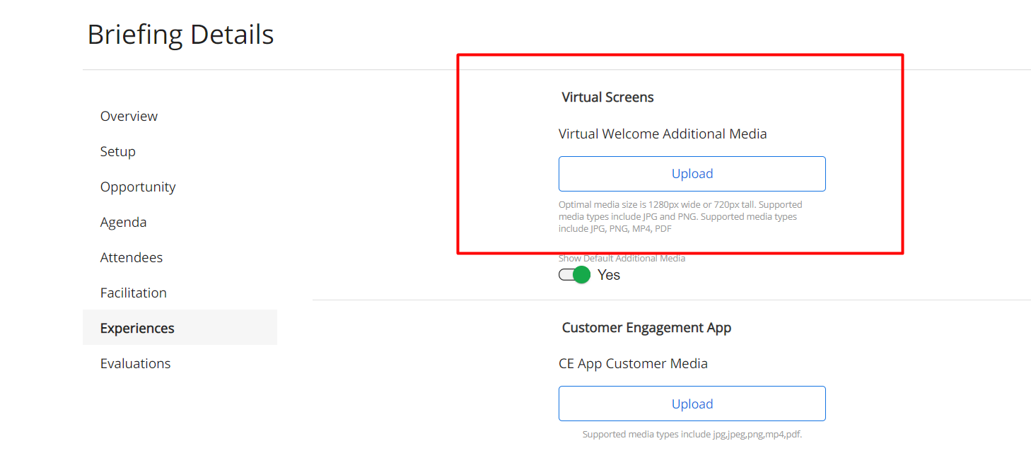 On the Experiences page of the Briefing Details users can customize their virtual screen with additional media items.