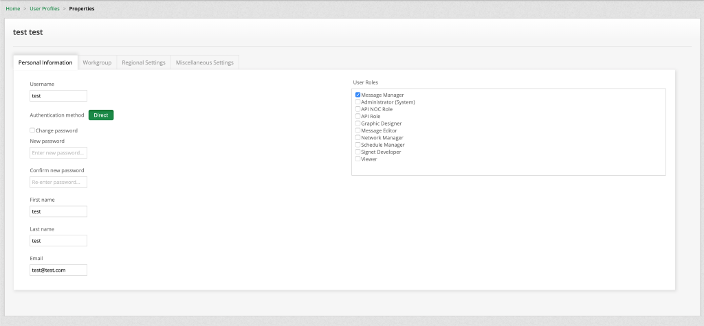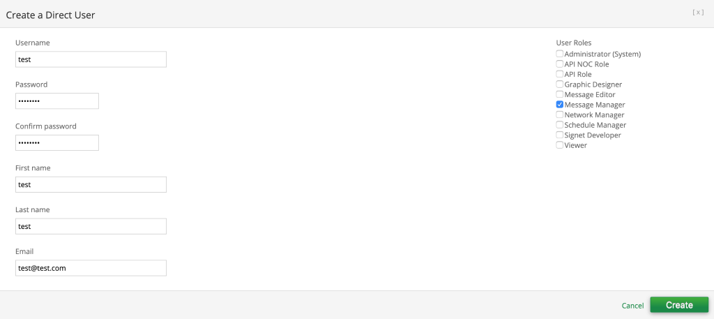 Complete all the fields and note the password needs to be 8 digits long. The typical user role assigned to a new user is Message Manager. Once the form is completed select Create.