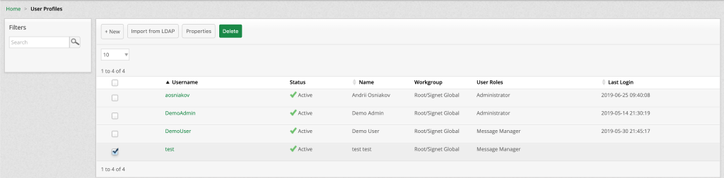 To delete User Profiles, select one or multiple Users and click