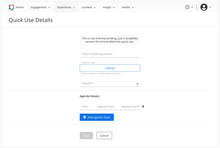 As a Briefing Manager you can create a quick event via Virtual Welcome Screen Quick Use form. The purpose of this functionality is to create a temporary event with a simple agenda item list (max 10 items)