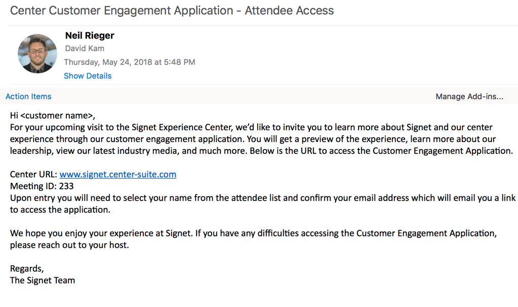There are a variety of ways for attendees to log into the CenterSuite app. Users can login directly to the briefing with the link provided to them in the email shown in Figure 1.1. Clicking on the link will take them into the app without any additional steps for logging in(Figure 1.2). This is the ideal login process for attendees who have an email address populated in BriefingSource.
