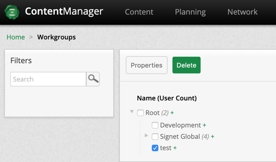 A hierarchical tree that defines a parent child relationship of the different locations a User, Media, Message, Template or Playlist can be associated to. Access to a parent node will give access and visibility to all the children nodes it’s associated with. Access to a child node will not give visibility to a parent.